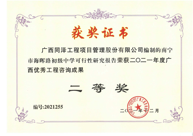 南寧市海暉路初級中學(xué)可行性研究報告榮獲2021年度廣西優(yōu)秀工程咨詢成果二等獎