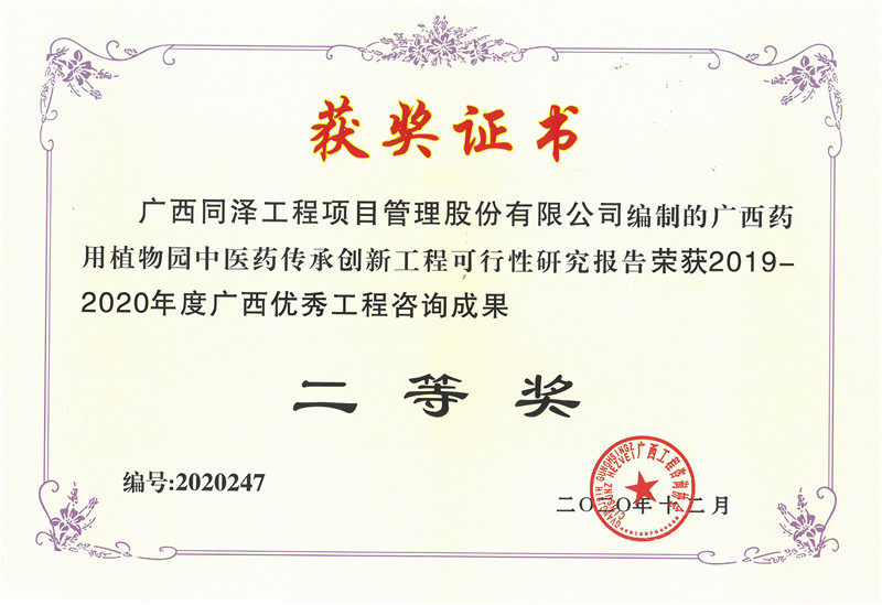 廣西藥用植物園中醫(yī)藥傳承創(chuàng)新工程可行性研究報告榮獲2019-2020年度廣西優(yōu)秀工程咨詢成果二等獎