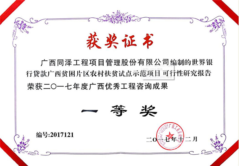 世辦銀行貸款廣西貧困片區(qū)農(nóng)村扶貧試點(diǎn)示范項目可行性研究報告榮獲2017年度廣西優(yōu)秀工程咨詢成果一等獎