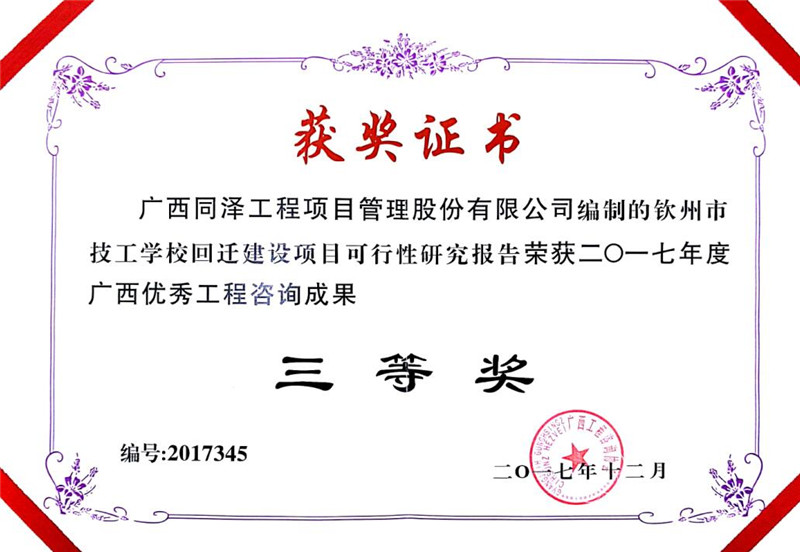 欽州市技工學(xué)?;剡w建設(shè)項目可行性研究報告榮獲2017年度廣西優(yōu)秀工程咨詢成果三等獎