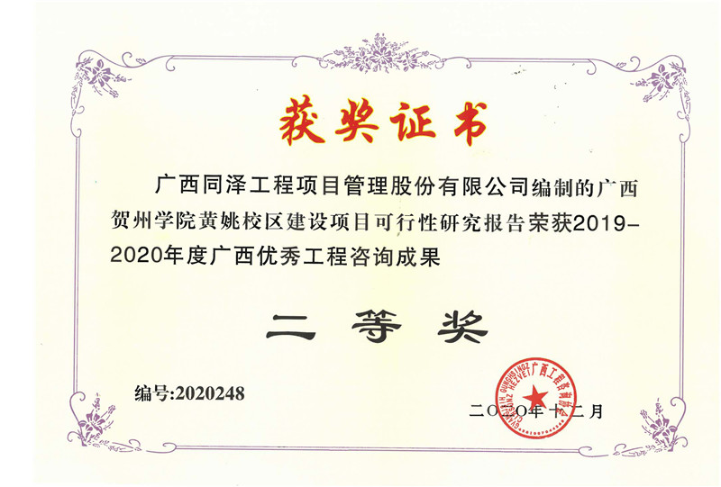 廣西賀州學(xué)院黃姚校區(qū)項目可行性研究報告榮獲2019-2020年度廣西優(yōu)秀工程咨詢成果二等獎