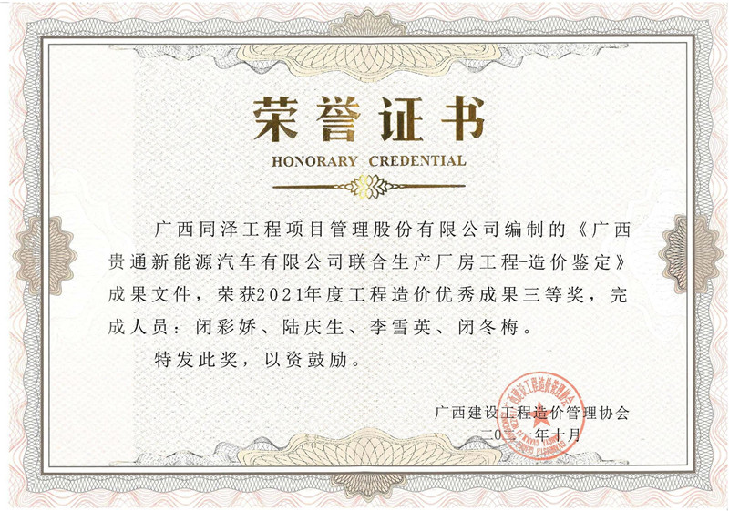 《廣西貴通新能源汽車廠房造價鑒定項目》榮獲2021年度工程造價優(yōu)秀成果三等獎
