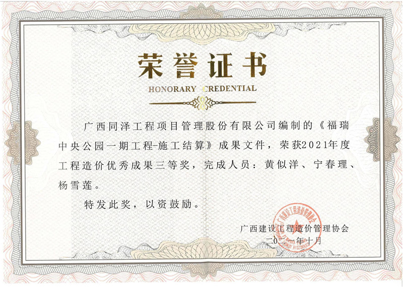 《福瑞中央公園一期工程-施工結(jié)算》榮獲2021年度工程造價優(yōu)秀成果三等獎