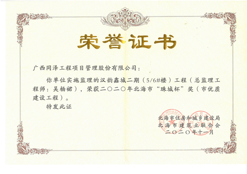 漢韻鑫城5#、6#樓榮獲2020年北海市“珠城杯獎”(市優(yōu)質(zhì)建設(shè)工程)
