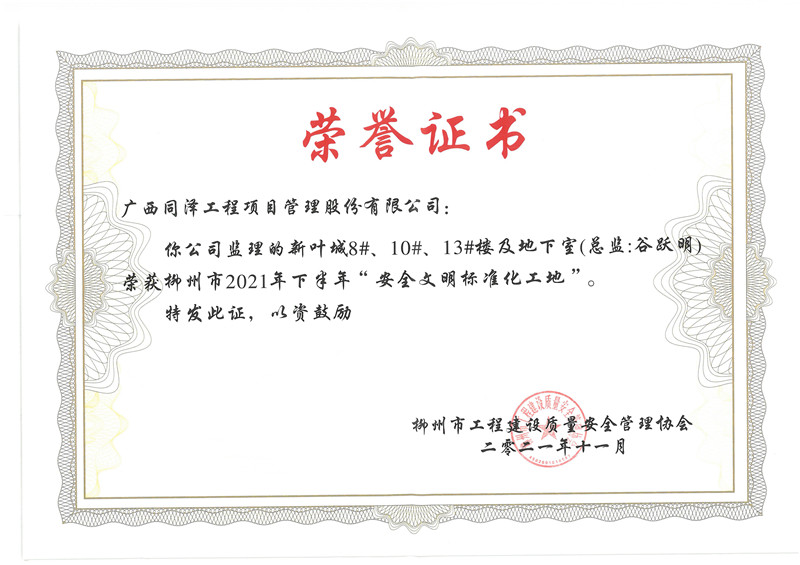 柳州新葉城項目8#、10#、13#樓及地下室項目榮獲柳州市2021年下半年安全文明標(biāo)準(zhǔn)化工地