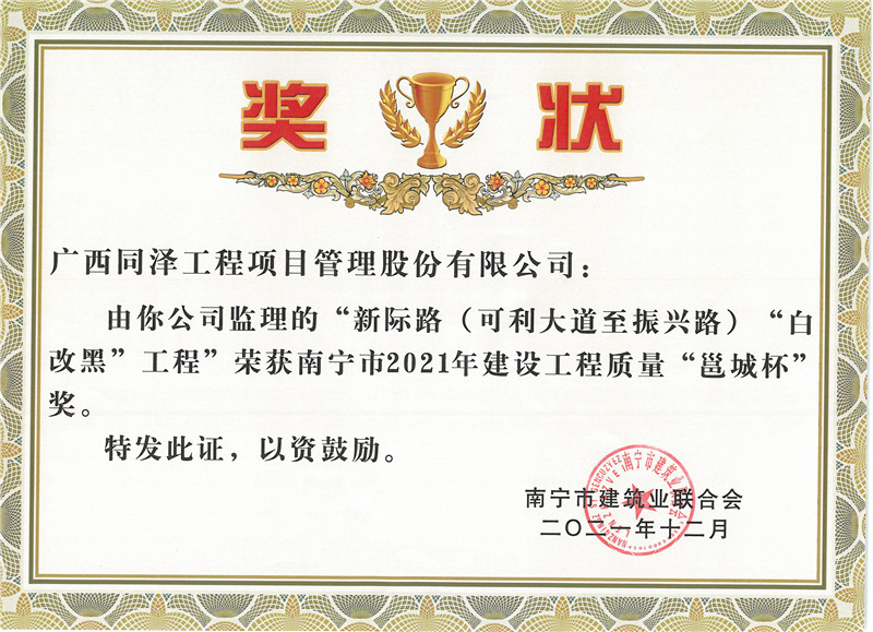 新際路(可利大道至振興路)“白改黑”工程榮獲南寧市2021年建設(shè)工程質(zhì)量“邕城杯”獎