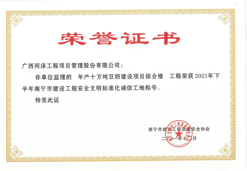 年產(chǎn)十萬噸豆奶建設(shè)項目綜合樓項目榮獲2021年下半年南寧市建設(shè)工程安全文明標(biāo)準(zhǔn)化誠信工地稱號