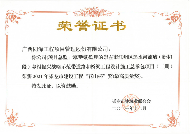 崇左市江州區(qū)黑水河流域(新和段)鄉(xiāng)村振興戰(zhàn)略示范帶道路和橋梁工程設(shè)計施工總承包項目(二期)項目榮獲2021年崇左市建設(shè)工程“花山杯”獎(最高質(zhì)量獎)