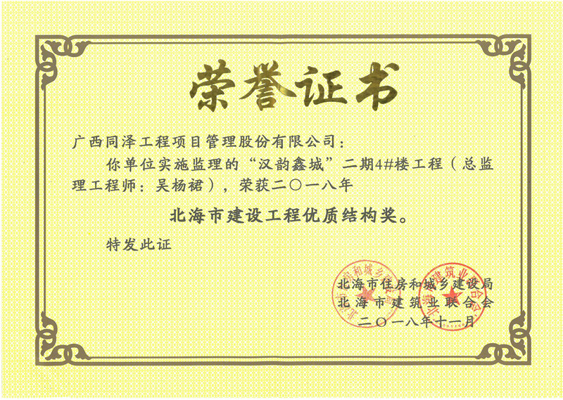 漢韻鑫城二期4#樓工程項(xiàng)目榮獲2018年度“建設(shè)工程優(yōu)秀結(jié)構(gòu)獎(jiǎng)”