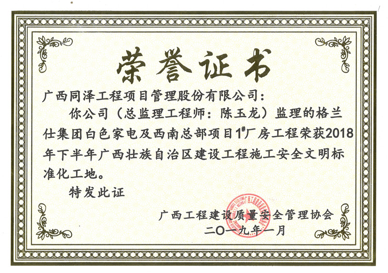 格蘭仕集團(tuán)白色家電及西南總部項(xiàng)目榮獲2018年度安全文明標(biāo)準(zhǔn)化工地