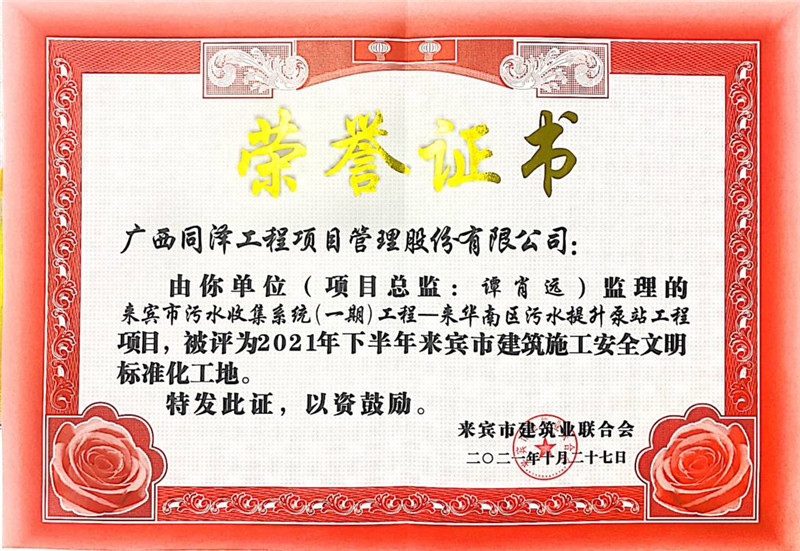 來(lái)賓市污水收集系統(tǒng)(一期)工程——來(lái)華南區(qū)污水提升泵站工程榮獲2021年度安全文明標(biāo)準(zhǔn)化工地