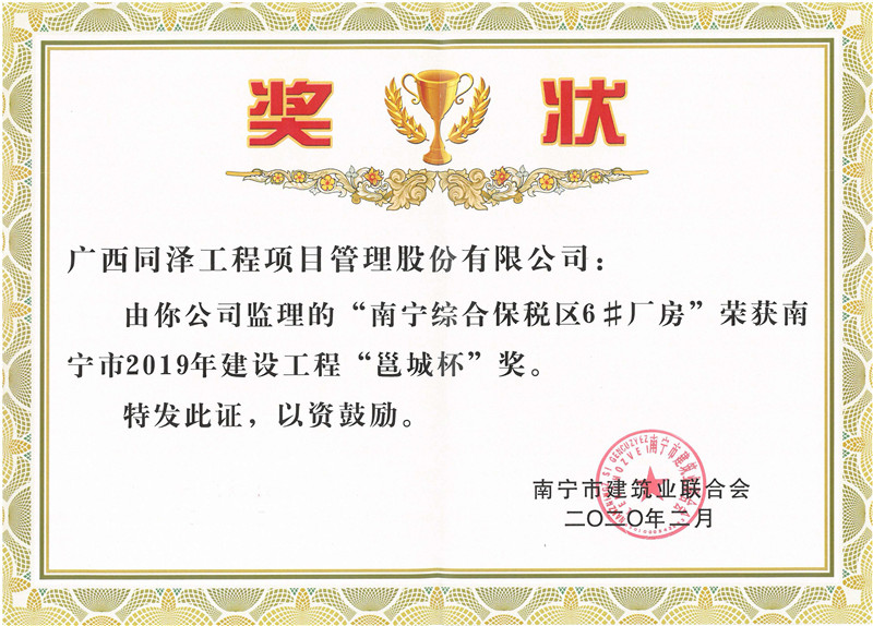 南寧綜合保稅區(qū)6#廠房項(xiàng)目榮獲2019年建設(shè)工程“邕城杯”獎(jiǎng)
