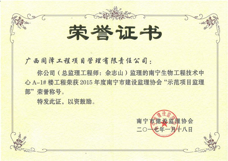 南寧生物工程技術(shù)中心A-1#樓項(xiàng)目榮獲2015年度“示范項(xiàng)目監(jiān)理部”榮譽(yù)稱(chēng)號(hào)