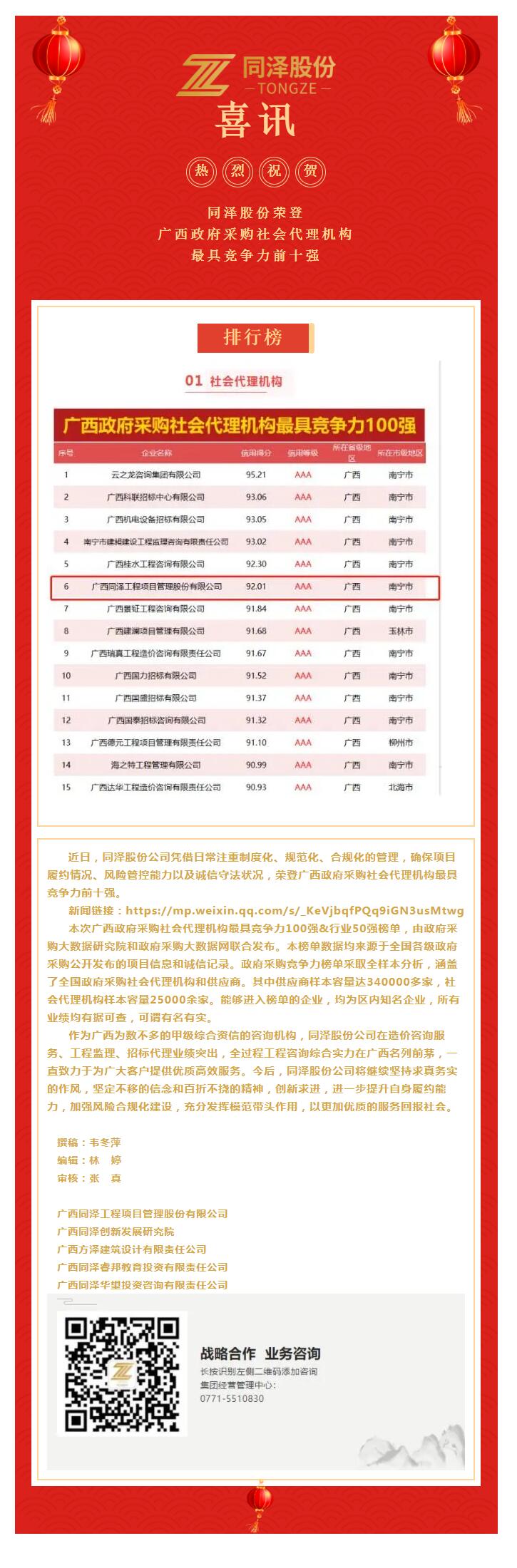喜訊|同澤股份榮登廣西政府采購社會(huì)代理機(jī)構(gòu)最具競爭力前十強(qiáng)
